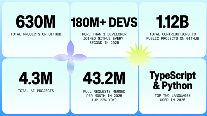GitHub total users: GitHub said in its yearly report that it now has more than 180 million users, hosts more than 630 million projects, and that TypeScript has now become to top programming language on the platform, dethroning Python.