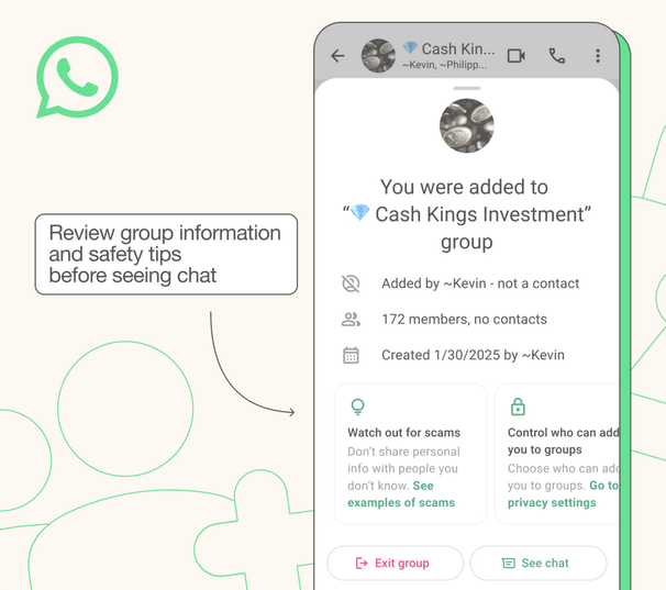 New WhatsApp anti-scam features: Meta will begin showing warning screens whenever strangers add users to new WhatsApp groups. Group content and notifications will be paused until users can review the group and opt to stay or leave. Meta designed the new feature as one of its anti-scam defenses.