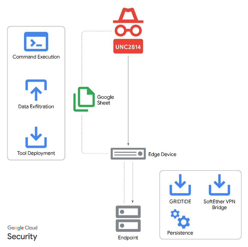 Google disrupts UNC2814: Google has taken down infrastructure used by a Chinese cyber-espionage group in attacks targeting telecoms and governments over the past three years. The company has disabled Google Cloud servers and Google Sheets accounts used for the command and control backend of a new backdoor named GRIDTIDE. Google says the malware is the work of a group it tracks as UNC2814.