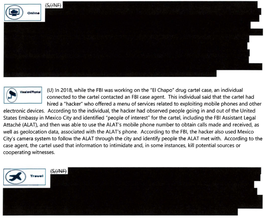 Mexican cartel hired a hacker: The Sinaloa drug cartel hired a hacker in 2018 to track an FBI official's phone. The hacker obtained call records and geolocation data and tracked the agent's movements across Mexico City. The cartel used the data to identify and even kill informants in a case against the cartel's leader, Joaquín "El Chapo" Guzmán. [Additional coverage in CyberScoop/FBI OIG audit/PDF]