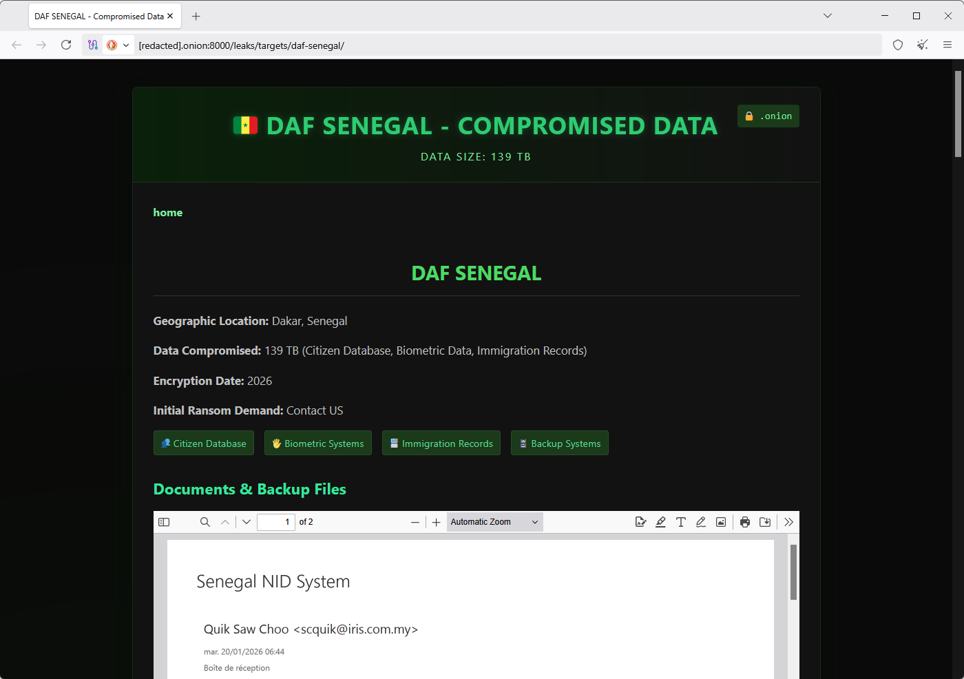 Major Senegal government breach: A newly launched ransomware group is holding Senegal's government for ransom. The Green Blood group claims to have stolen 139TB of data from the country's Department for the Automation of Records (DAF). The agency holds extremely sensitive information on all the country's population. It stores data used for identity, biometric, electoral, and immigration systems. DAF technicians are working to restore affected systems. The country's tax agency was also hit by a ransomware group last October. [The Gambia Journal]