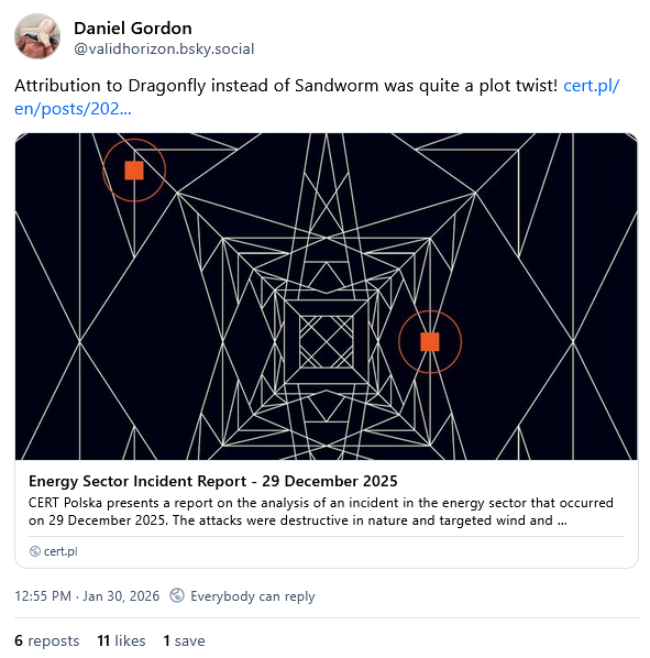New attribution for the Poland energy grid attack: Polish officials have attributed the data-wiping attack on its national power grid to a Russian hacking group known as Dragonfly (Static Tundra, Berserk Bear, Ghost Blizzard). An initial report from ESET linked the attack to Sandworm, a cyber unit inside Russia's military. Dragonfly is a group widely considered to be associated with Russia's FSB intelligence service. Threat intel researcher Joe Slowik believes multiple Russian groups may have collaborated on the attack. A report published by Poland's CERT found that the affected energy providers failed to adequately secure their networks, which aided the attack.