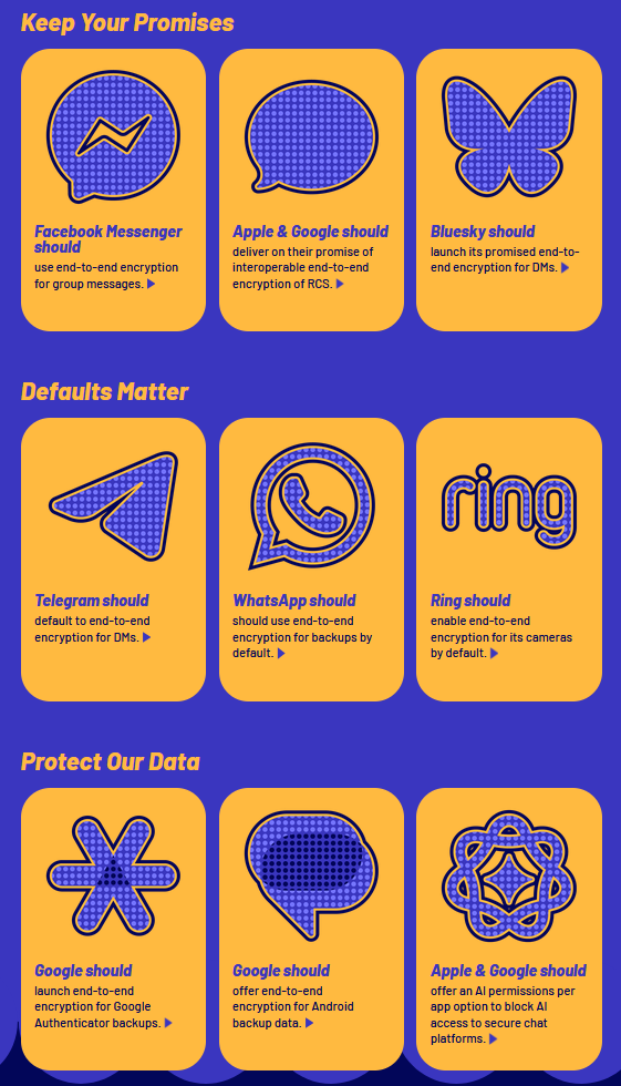 Fix It Already: The EFF has launched a public-awareness campaign to get various service providers to implement end-to-end encryption into their products. The list includes BlueSky, Telegram, Apple, Google, and more.