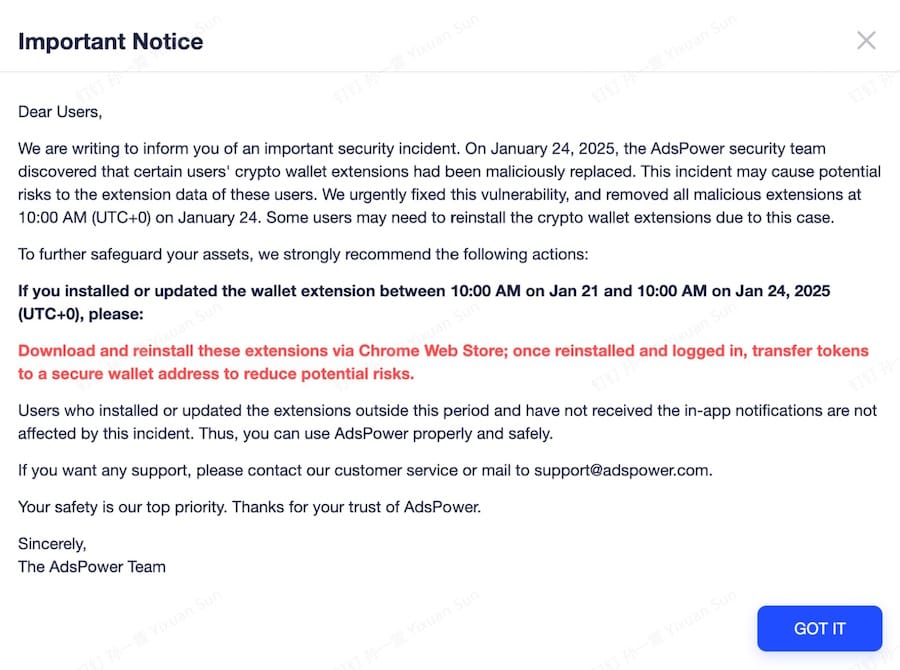 AdsPower, which develops a multi-profile privacy-centric browser, says that users who downloaded and installed cryptocurrency wallet extensions between January 21, 10:00 AM, and January 24, 10:00 AM (UTC+0) were likely affected.