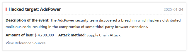 A threat actor has compromised the AdsPower browser platform and injected malicious code that modified third-party crypto wallet extensions and stole user funds.