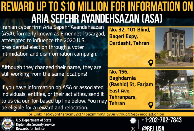 ASA reward: The US State Department is now offering a $10 million reward for information on a company named Aria Sepehr Ayandehsazan. According to a recent FBI report [PDF], this is the new company from which the old Emennet Pasargad threat actor is now operating.