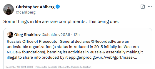 Russia sanctions Recorded Future: The Russian government has added security firm Recorded Future to its list of "undesireable" organizations. The Kremlin cited the company's work with Ukraine and foreign intelligence agencies to support so-called "propaganda" against Russia. Russian officials say the company also collects and analyzes data on its armed forces. Recorded Future was one of the first security firms to provide aid to Ukraine after Russia's invasion, together with Microsoft and Cisco Talos. Over the past two years, Recorded Future has published numerous reports exposing Russia's hacking and influence operations. It has also helped its prosecutors investigate war crimes.