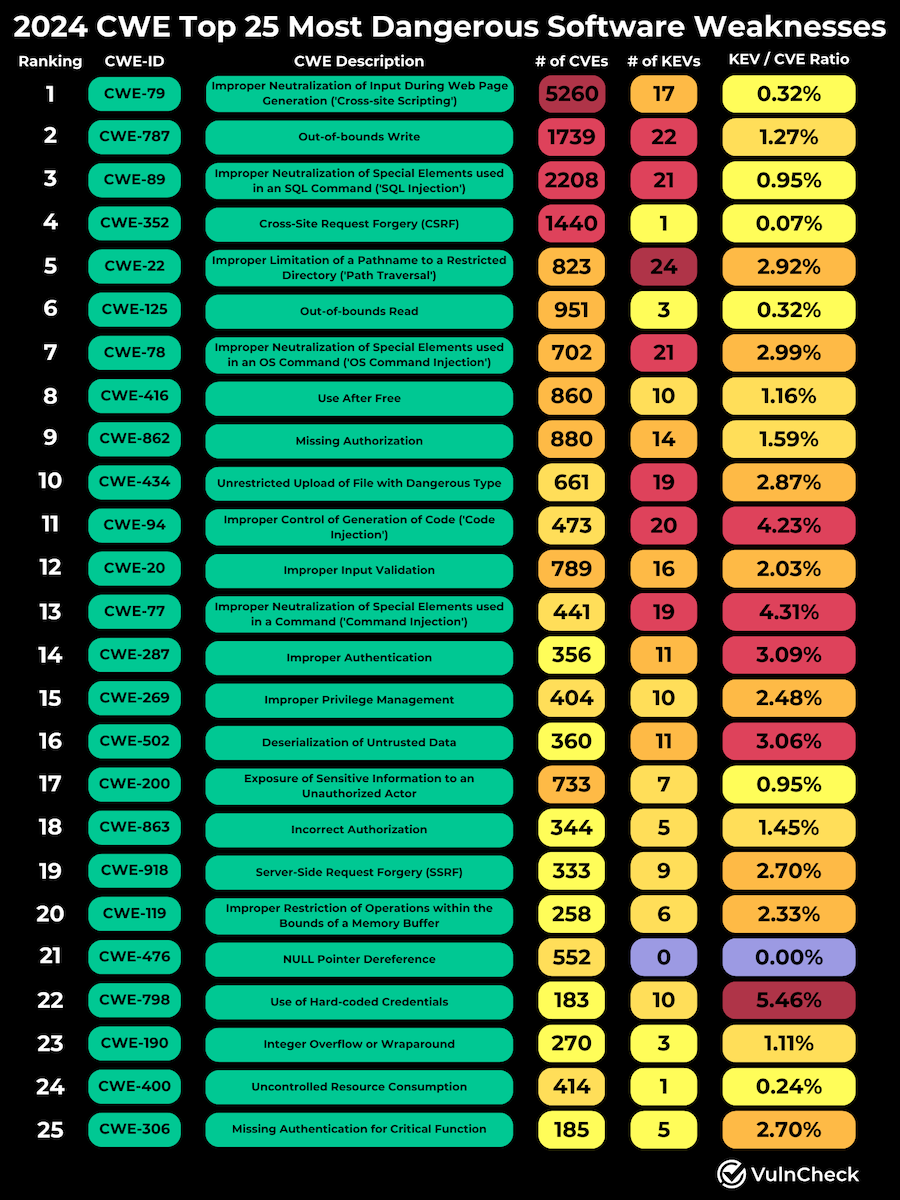 CWE stats: VulnCheck takes the MITRE Top 25 CWEs and compares it to the CISA KEV CWEs to see what are this year's true top security weaknesses.