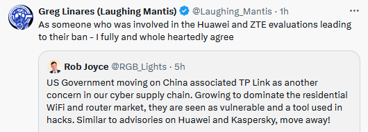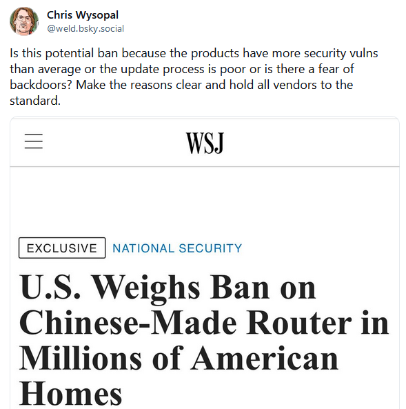 US considering TP-Link ban: The US government is considering a ban of TP-Link products in the US on the grounds of national security. Officials say the company's routers have been linked to cyberattacks against US critical infrastructure. According to reports, the Commerce, Defense, and Justice departments have opened separate investigations into the Chinese company. An official ban is expected early next year. [Additional coverage in the Wall Street Journal]