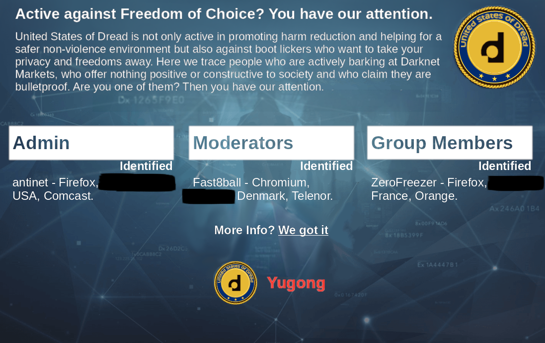 AntiDark defaced: AntiDark, an online community that hunted and exposed cybercrime on the dark web, had its website defaced by a group calling itself the "United States of Dread." The group originates from Dread, a dark web forum where illegal dark web marketplaces advertise their services. The Dread group claims it has identified the real identity of three AntiDark admins.