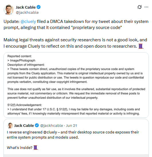 Streisand effect hits Cluely: AI company Cluely used a DMCA to take down a security researcher's tweet that exposed a security issue, and managed to draw even more eyes to its issue. Good job, y'all!