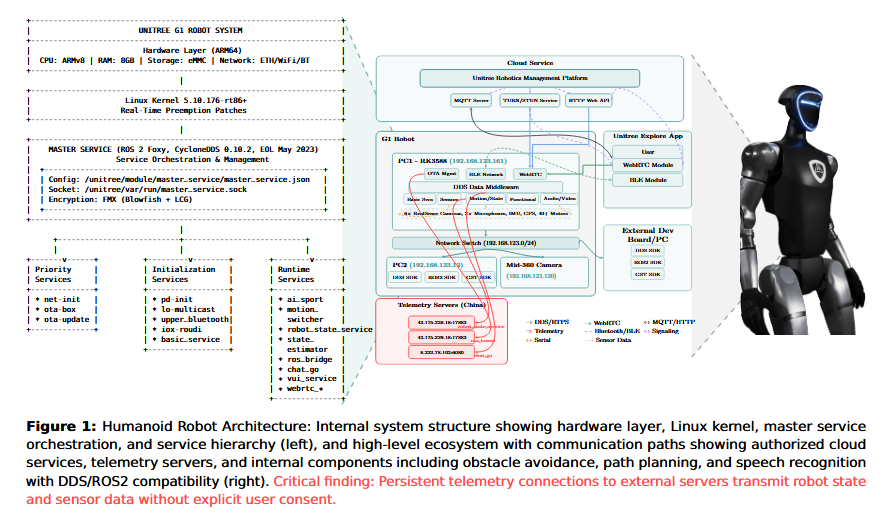 Unitree collects everything: Unitree G1 humanoid robots collect and send sensor and other telemetry data to servers in China without the owner's knowledge or consent. The collection happens every five minutes, according to a team of researchers who reverse-engineered the robot's firmware. The G1 also contains BLE vulnerabilities (codenamed UniPwn) that can be exploited to pivot to a customer's internal network. [Additional coverage in IEEE Spectrum]