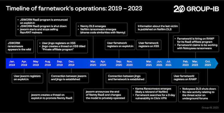 A Group-IB report published in November 2023 linked the farnetwork persona to four other ransomware groups and multiple other malware strains.