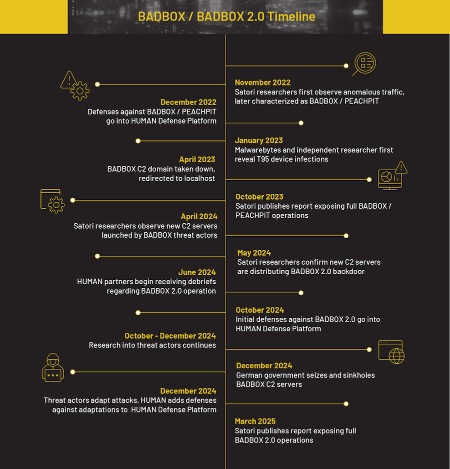 BADBOX disrupted after return: A coalition of security firms has disrupted a new version of the BADBOX botnet. Companies sinkholed botnet traffic and took down 24 Android apps used to infect user devices. The botnet used preinstalled backdoors and malicious apps to infect devices. The devices were used to relay malicious traffic and ad fraud. HUMAN Security says it identified four different threat actors operating different parts of the botnet and cooperating with each other (SalesTracker, Lemon, MoYu, and LongTV). The new BADBOX v2 botnet infected over one million devices and launched this year after German authorities sinkholed the first version at the end of last year.