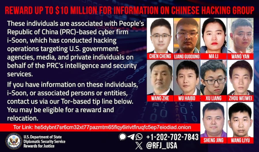 The US State Department is also offering a reward of up to $10 million for additional information on i-Soon and its government handlers.