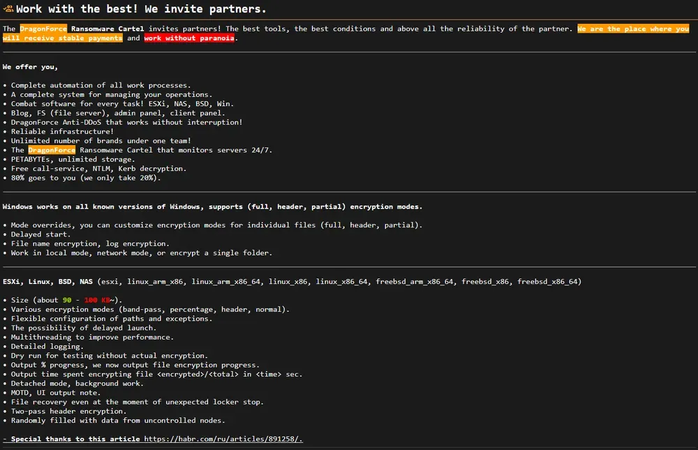 DragonForce ransomware: The Acronis security team has published a comprehensive report on the evolution of the DragonForce ransomware group—from a Conti-derived RaaS to alliances with The Com members.