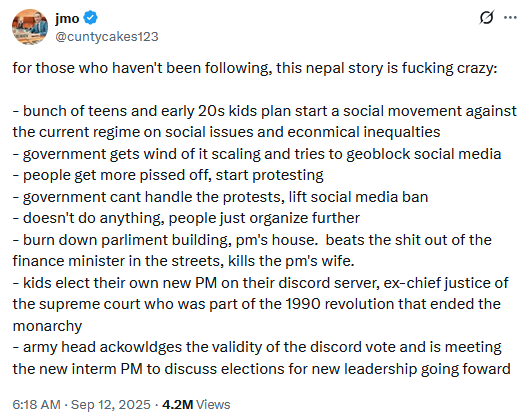Nepal protesters choose next PM via Discord: The Gen-Z protesters who overthrew the Nepalese government last week have elected a new Prime Minister over a Discord vote. Yes, you read that correctly. [Additional coverage in Yahoo Finance]