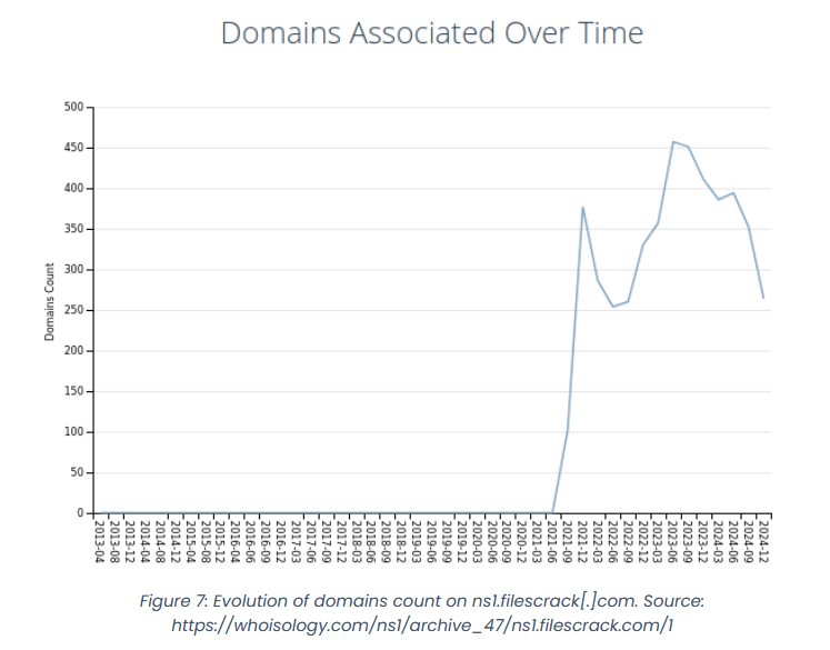 "Nameservers of the domain filescrack[.]com, registered by the same Pakistani individuals, were used since 2021 for more than 300 cracking websites. Additionally, the hosting provider 24xservice, may be used by this network of freelancers to register domains of cracking websites. In fact, the range 216.143[.]0/24 hosted by AS57717 (24xhosting) is almost full of cracking websites."