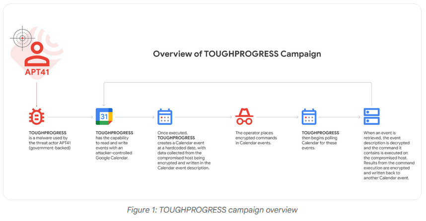 APT41 uses Google Calendar as C2: The Google Cloud security team has spotted Chinese cyber-espionage group APT41 deploy the TOUGHPROGRESS malware in recent attacks, a backdoor that uses Google Calendar as a command-and-control channel.