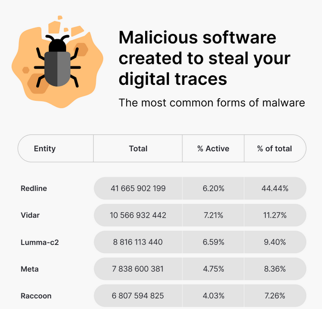 Stolen cookies statistics: According to a report from NordVPN, there are now 93.7 billion stolen cookies circulating or being sold on the dark web, with almost half coming from infections with the Redline Stealer.