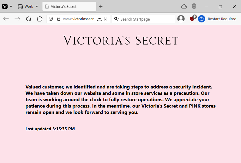 Victoria's Secret cyberattack: Lingerie company Victoria's Secret has taken down its US website in the aftermath of a cyberattack. Stores are still open for business, but some in-store services have been halted as the company restores IT systems. The company did not provide additional details. Victoria's Secret operates over 1,300 retail stores across 70 countries. [Additional coverage in the BBC]