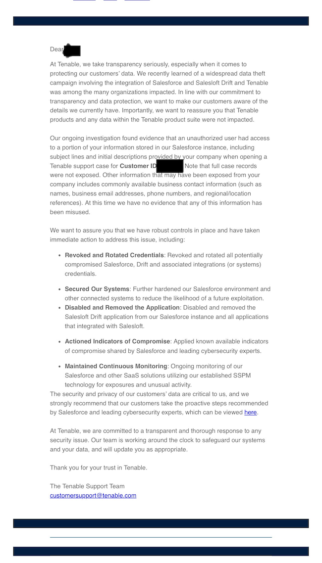 Salesloft hack impacts Zscaler, PAN, more: Victims of the Salesloft hack from last month are starting to notify their customers after hackers used the Salesloft Drift AI chat agent to steal data from their Salesforce accounts. The list of affected companies includes security firms Cloudflare, Zscaler, Palo Alto Networks, Tenable, SpyCloud, and Tanium, along with SaaS platforms PagerDuty and Exclaimer, and cloud platform Cloudinary. These are the first confirmed intrusions. The Salesloft incident is expected to have a much larger impact. [Additional coverage in HelpNet Security] [This item was updated to remove Astrix Security as being affected.]