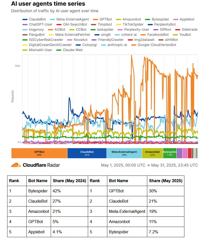 Crawler stats: OpenAI's ChatGPT bot is this year's most aggressive AI crawler, according to Cloudflare stats.