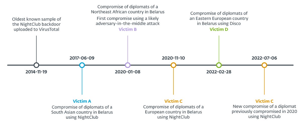 MoustachedBouncer: Security firm ESET has discovered a new APT group that has been conducting cyber-espionage operations against foreign embassies inside Belarus. Named MoustachedBouncer, the group has operated under the radar for at least nine years since 2014. The group's primary toolkit is a malware framework named NightClub and a backdoor named Disco. Some of the group's 2020 operations also involved the use of Adversary-in-the-Middle techniques at the ISP level, which has led ESET to believe that the group may be closely associated with the Belarusian government. Further evidence suggests the group may be cooperating with another APT named Winter Vivern.