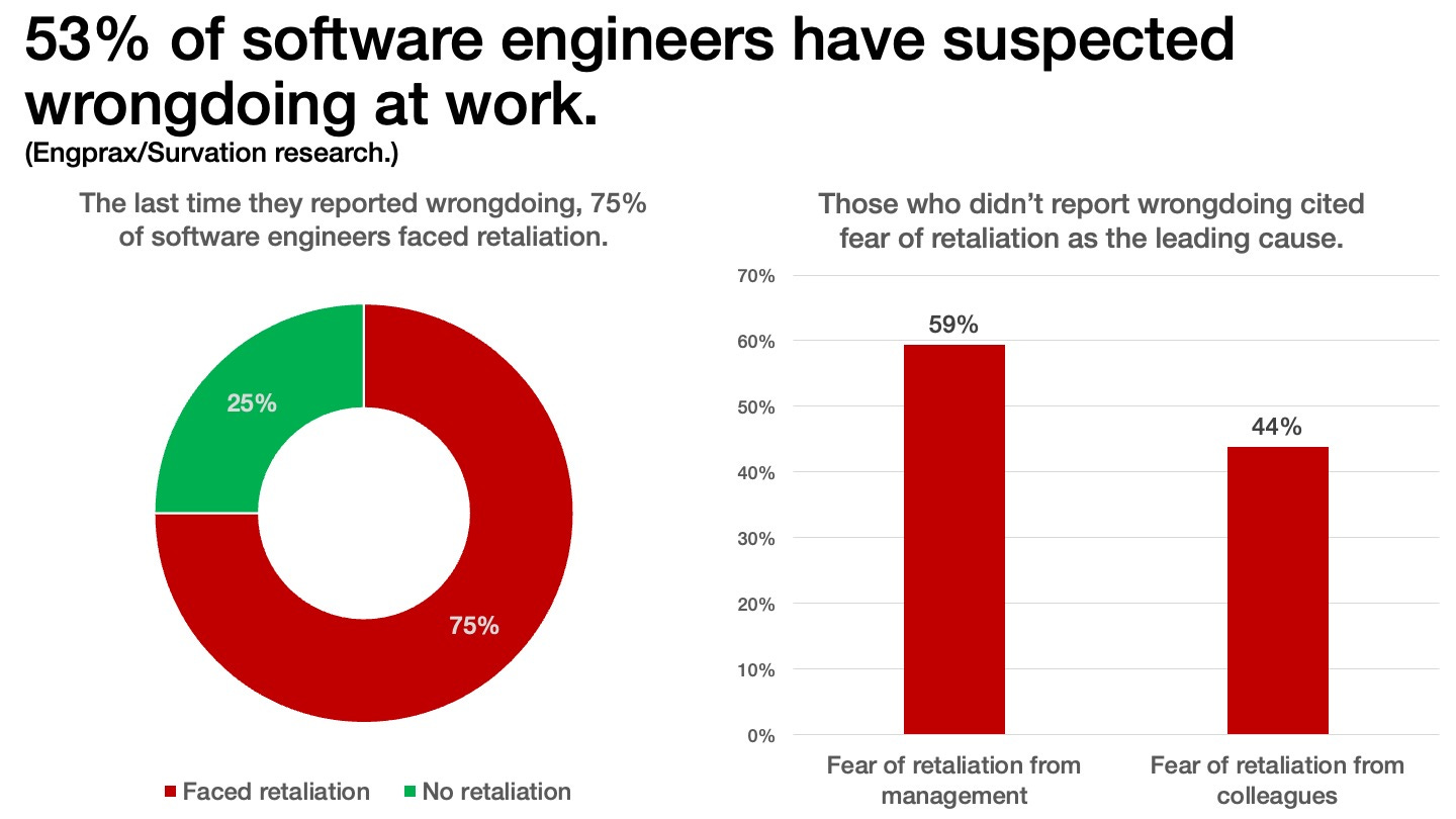 Retaliation at work: A recent Engprax survey of almost 2,000 software engineers found that 53% of respondents witnessed or suspected wrongdoing in their workplace. Of those who spoke up, 75% reported facing retaliation after they reported wrongdoing to their employers. Those who didn't report anything cited fear of retaliation as the primary reason.