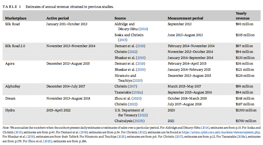 Hydra dark web market analysis: A team of US academics has published a detailed analysis of Hydra, the largest dark web marketplace seen so far. The research comes with this interesting table showing annual revenue estimates for the largest dark web markets of the last decade.