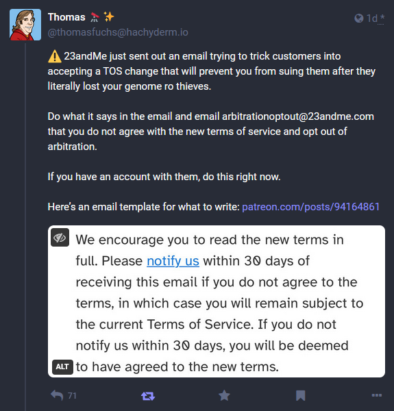 23AndMe breach data: DNA and genetic testing service 23andMe has rolled out an update to its Terms of Service that blocks users from suing the company and forces them into a binding arbitration agreement. The company took this step days after it changed the size of a data breach that took place in October. 23AndMe initially said that hackers stole data on only 1% of the company's users. The company later changed the tally to 6.9 million users, representing almost half of the company's 14 million userbase. [Additional coverage in StackDiary]