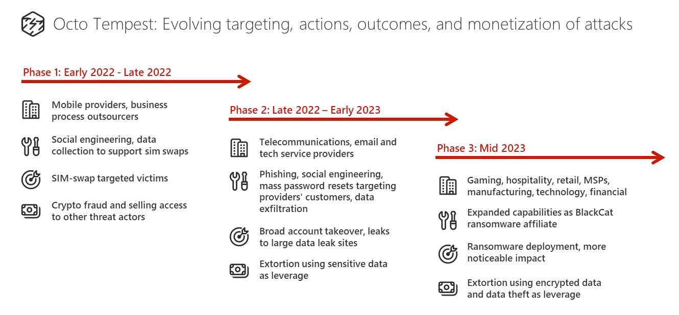 A new Microsoft report describes the evolution of a group it calls Octo Tempest and charts its increasingly aggressive tactics and the rapid change in its targets. In early 2022, Octo Tempest focused on social engineering and targeting mobile providers to enable SIM-swapping crimes such as cryptocurrency theft, and selling the access gained to other criminals.