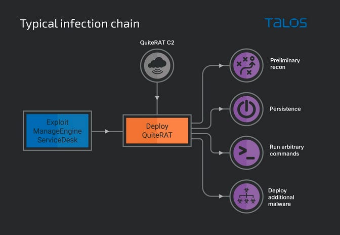 Lazarus Group ManageEngine hacks: The Lazarus North Korean hacking group has used a vulnerability in the Zoho ManageEngine platform (CVE-2022-47966) to breach companies and infect their systems with a new malware strain known as QuiteRAT. Cisco's Talos security division says the attacks began in February this year, five days after proof-of-concept code was published online for the Zoho vulnerability. Talos says they spotted Lazarus successfully compromise an internet backbone and healthcare companies in Europe and the US. Cisco's investigation into the attacks also allowed it to identify another new malware strain created by the group, named CollectionRAT.
