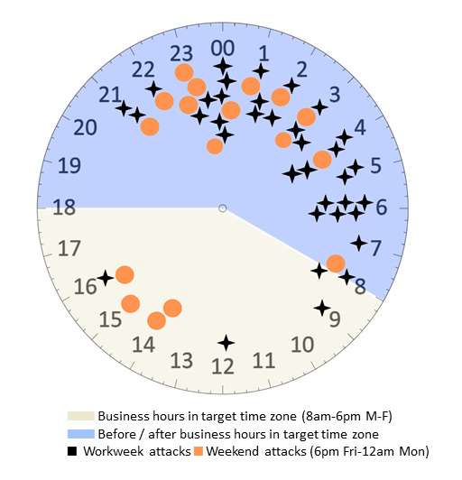 Ransomware gangs prefer the nights: Most (81%) ransomware attacks take place at night, outside of normal business hours when IT and security teams are likely to be out of the office. The very few times an attack takes place during regular hours are during weekends when security teams are likely to be out as well. According to intrusion data gathered by Sophos, adversary dwell times in the first half of the year have been roughly eight days, in line with observations made by other security firms. For ransomware, in particular, the dwell time is smaller, at just five days, meaning companies need to react even faster.
