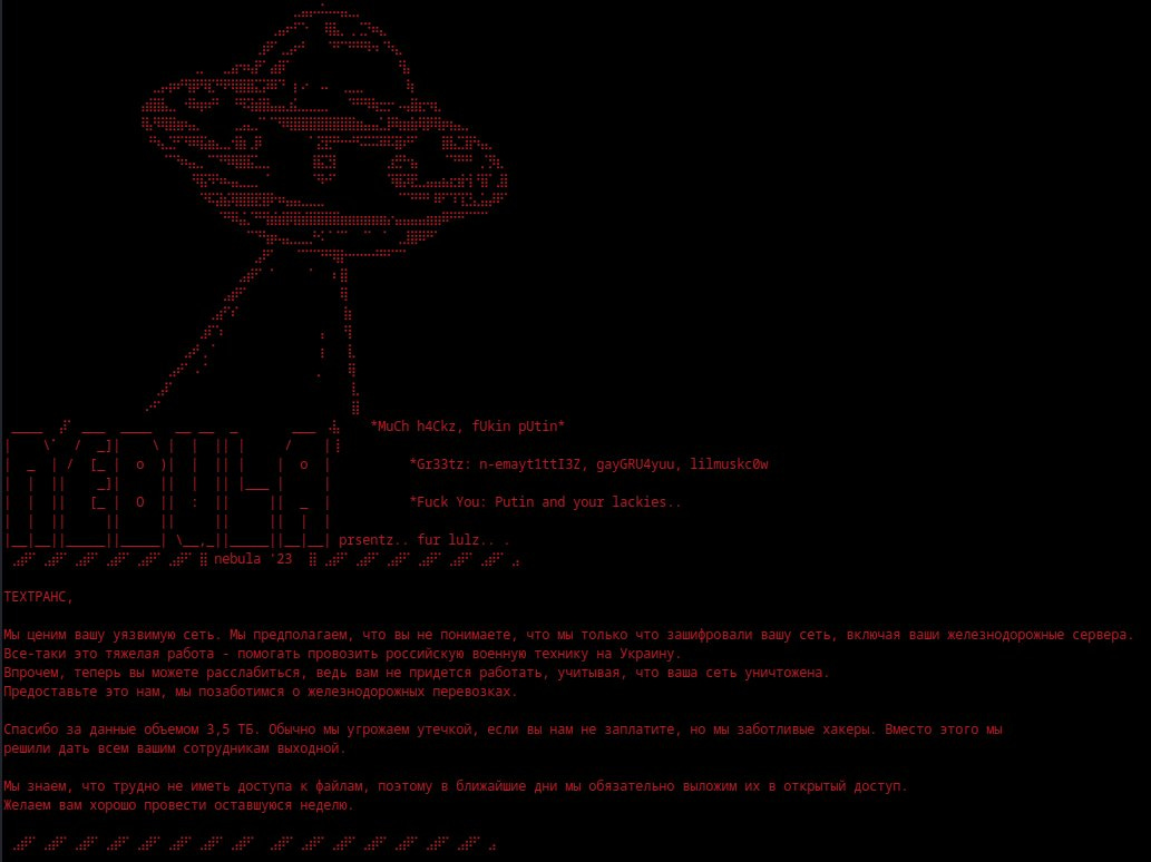 Tehtrans incident: A pro-Ukraine hacktivist group named Nebula claims to have breached and destroyed the website and internal network of Russian railway company TehTrans. The hackers also claim to have stolen 3.5TB of data, which they plan to release in the coming days. The group says it conducted the attack because TehTrans transported weapons and military equipment for Russia's war effort in Ukraine. [Additional coverage in the Kyiv Post]